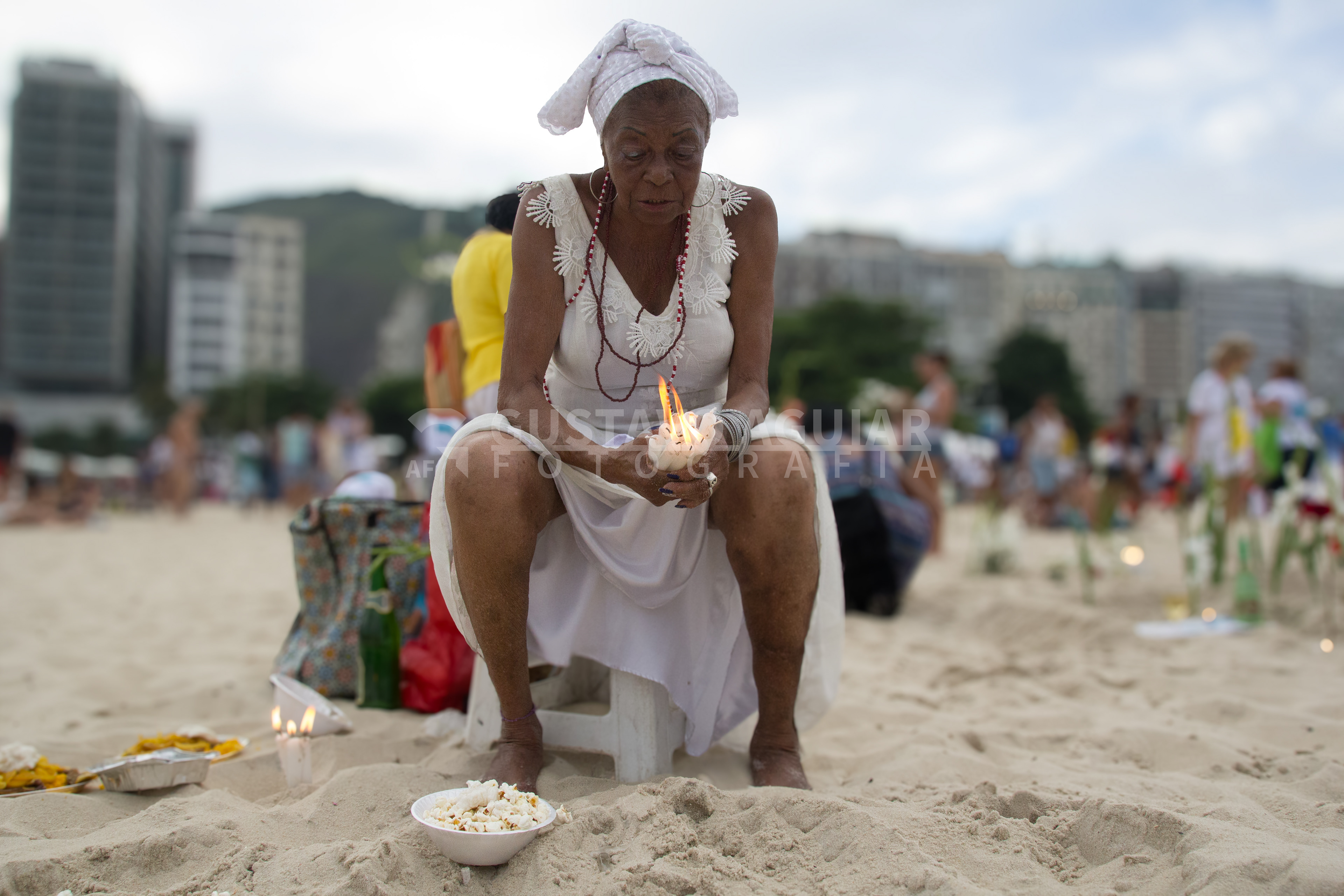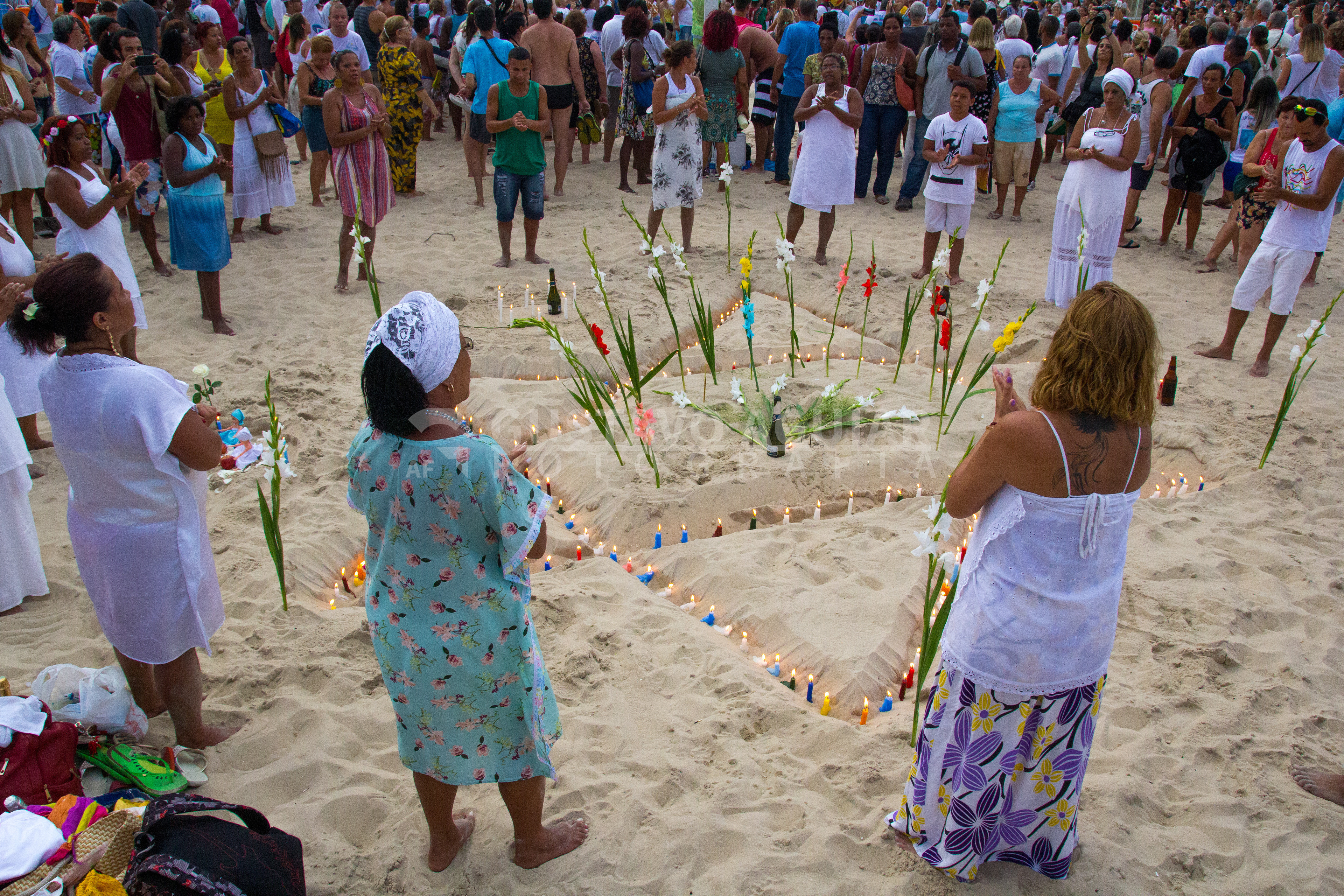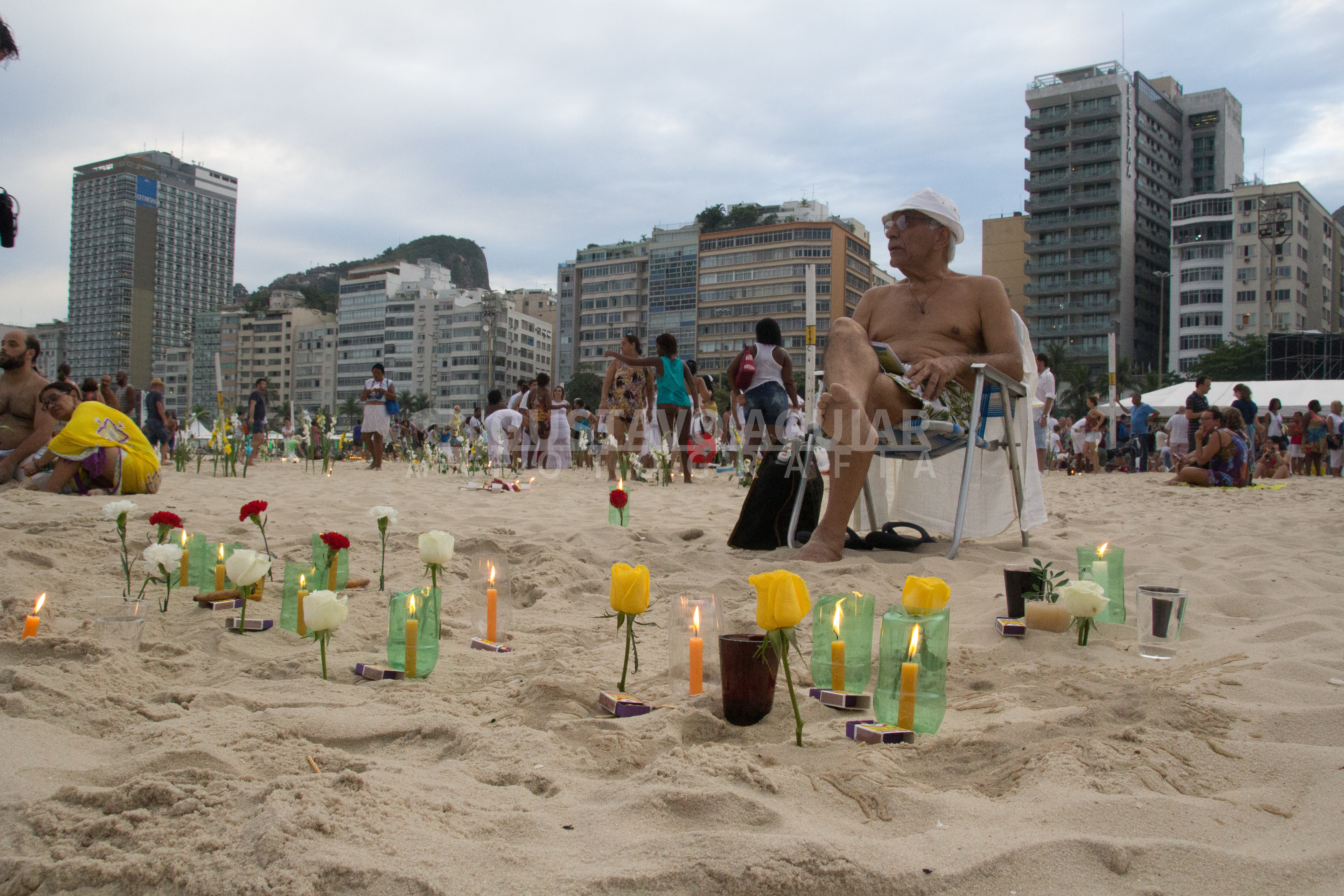 No dia 29 de dezembro de 2015, estive em Copacabana, no Rio de Janeiro, para registrar a Festa de Iemanjá. A celebração, marcada por cortejos, oferendas e homenagens à orixá das águas salgadas, reuniu uma multidão na areia. Enquanto alguns estavam ali apenas para aproveitar o belo fim de tarde de verão, muitos se juntavam para expressar sua fé e reverência à Santa.